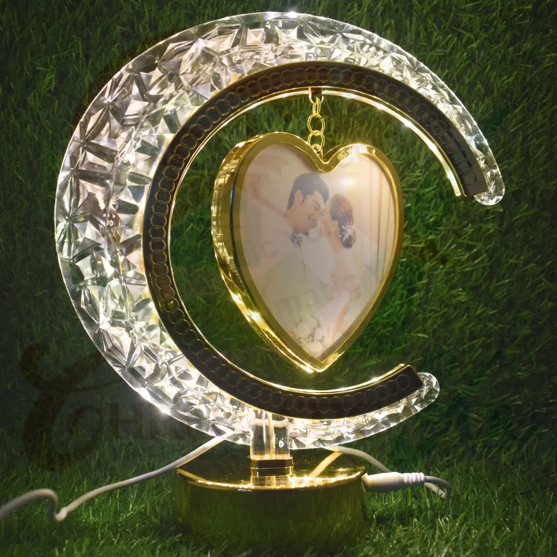 Touch Control LED Moon Light Shape Photo Frame with Hanging Heart Accent – Illuminate Your Love Story
